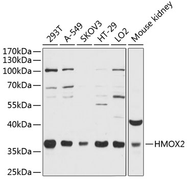Western blot analysis of extracts of various cell lines, using HMOX2 antibody. |