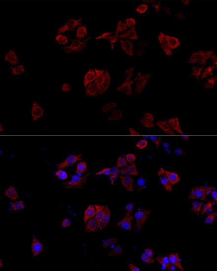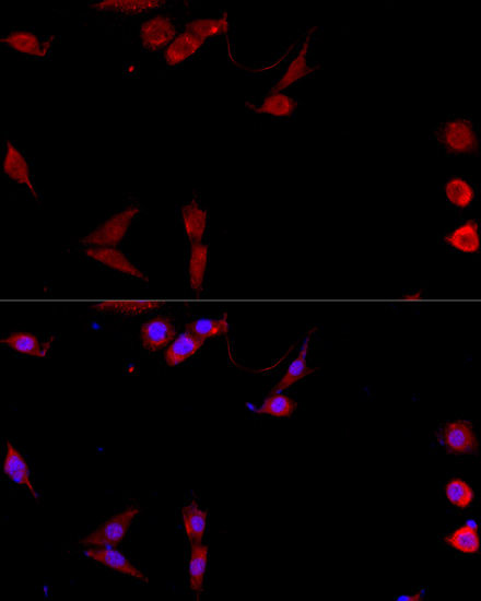 Immunofluorescence analysis of NIH/3T3 cells using CD40LG antibody. |