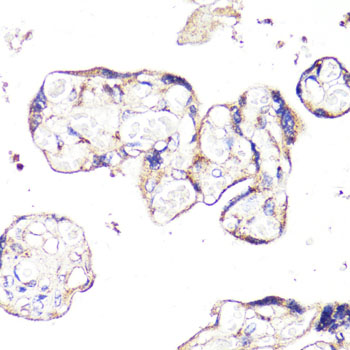 Immunohistochemistry of paraffin-embedded human placenta using IGF2R antibody.