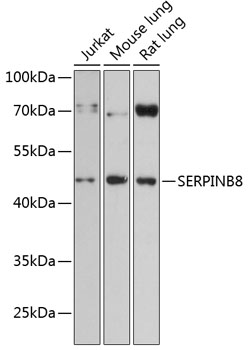 Western blot analysis of extracts of various cell lines, using SERPINB8 antibody. |