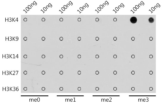 Dot-blot analysis of all sorts of methylation peptides using TriMethyl-Histone H3-K4 antibody.