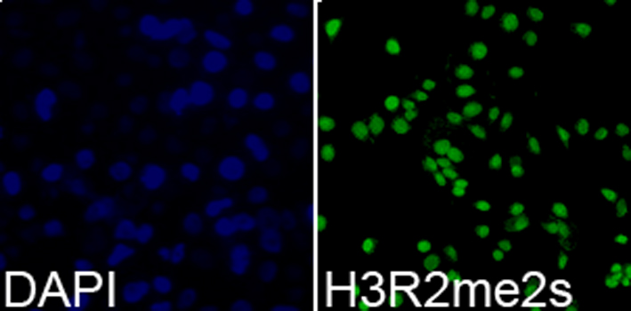Immunofluorescence analysis of 293T cells using Symmetric DiMethyl-Histone H3-R2 antibody. |