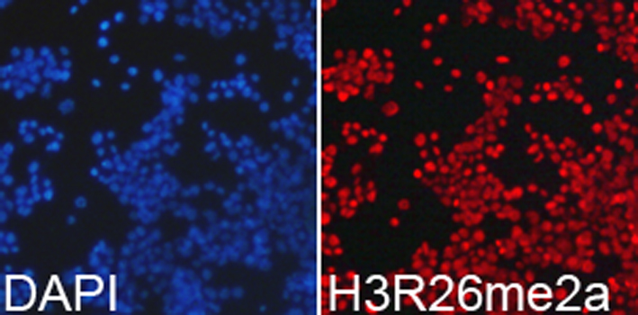 Immunofluorescence analysis of 293T cells using Asymmetric DiMethyl-Histone H3-R26 antibody. |