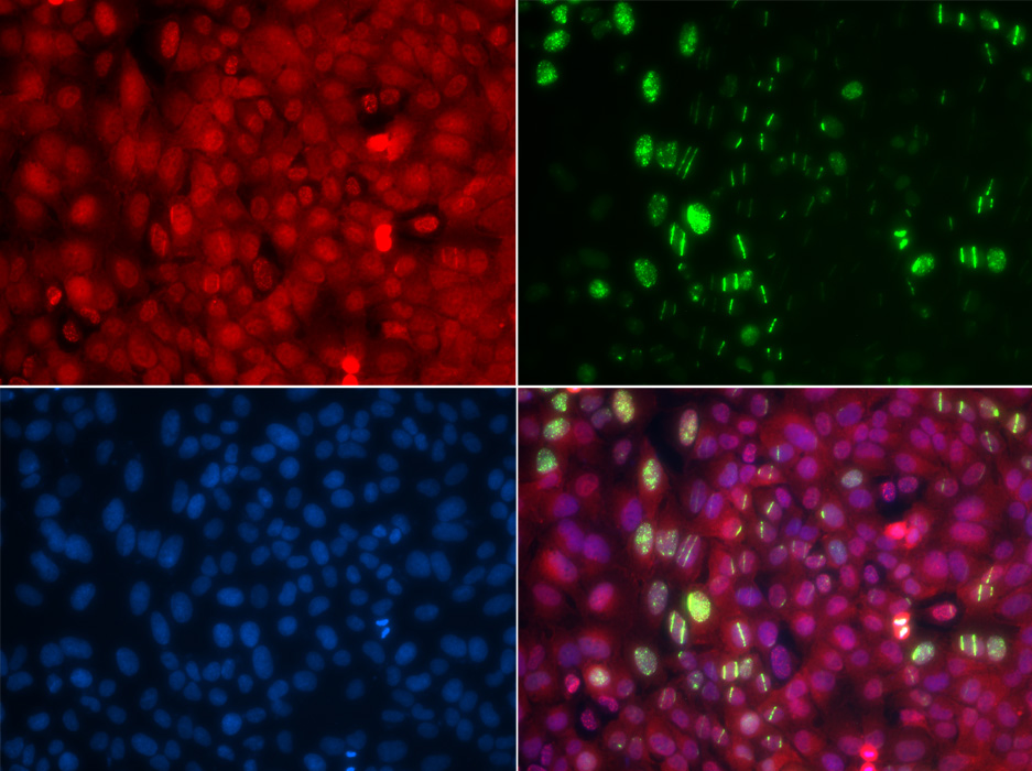 Immunofluorescence analysis of U2OS cells using Phospho-ABL1-Y204 antibody.