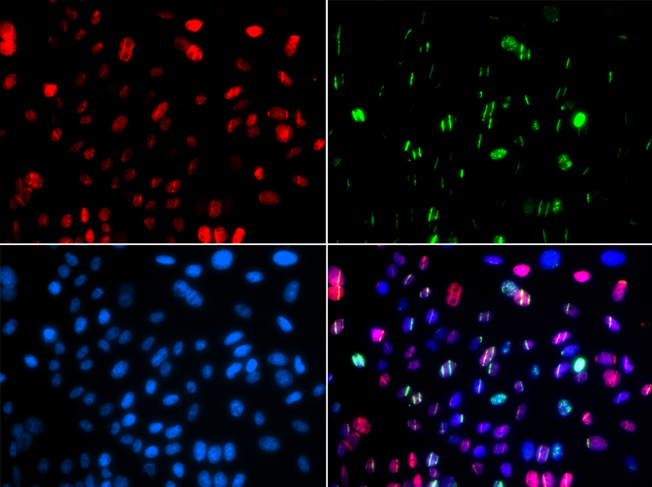 Immunofluorescence analysis of GFP-RNF168 transgenic U2OS cells using Phospho-TP53-S15 antibody.