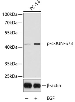 Western blot analysis of extracts from PC14 cells using Phospho-c-JUN-S73 antibody. |
