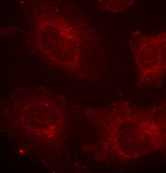 Immunofluorescence analysis of methanol-fixed HeLa cells using Phospho-GAB1-Y627 antibody. |