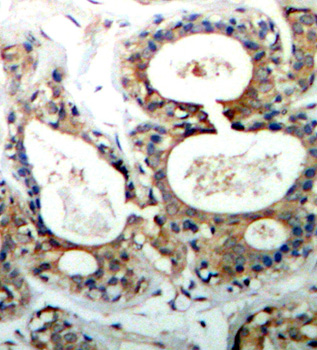 Immunohistochemistry of paraffin-embedded human breast carcinoma using Phospho-PTPN11-Y542 antibody. |