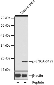 Western blot analysis of extracts from mouse brain tissue, using Phospho-SNCA-S129 antibody. |
