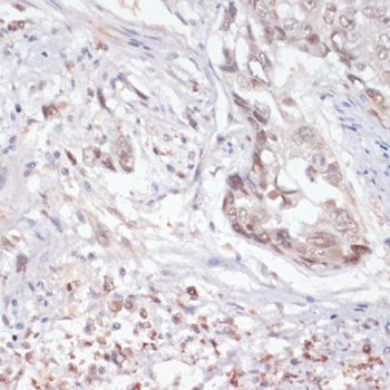 Immunohistochemistry of paraffin-embedded human lung cancer using Phospho-Jak2-Y1007/1008 antibody. |