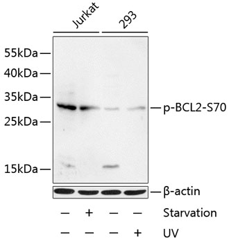 Western blot analysis of extracts of Jurkat and 293 cells, using Phospho-Bcl2 -S70 antibody.