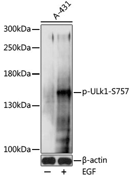 Western blot analysis of extracts of A431 cells, using Phospho-ULk1-S757 pAb. |